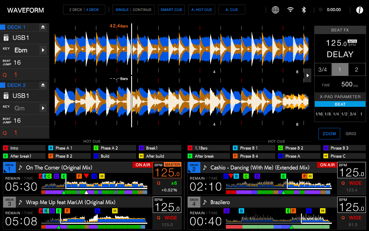 Čtyřkanálová DJ konzole pro Rekordbox DJ a Serato DJ Pro. Bez nutnosti připojení počítače. Součástí zápůjčky je ochranný obal a napájecí kabel.