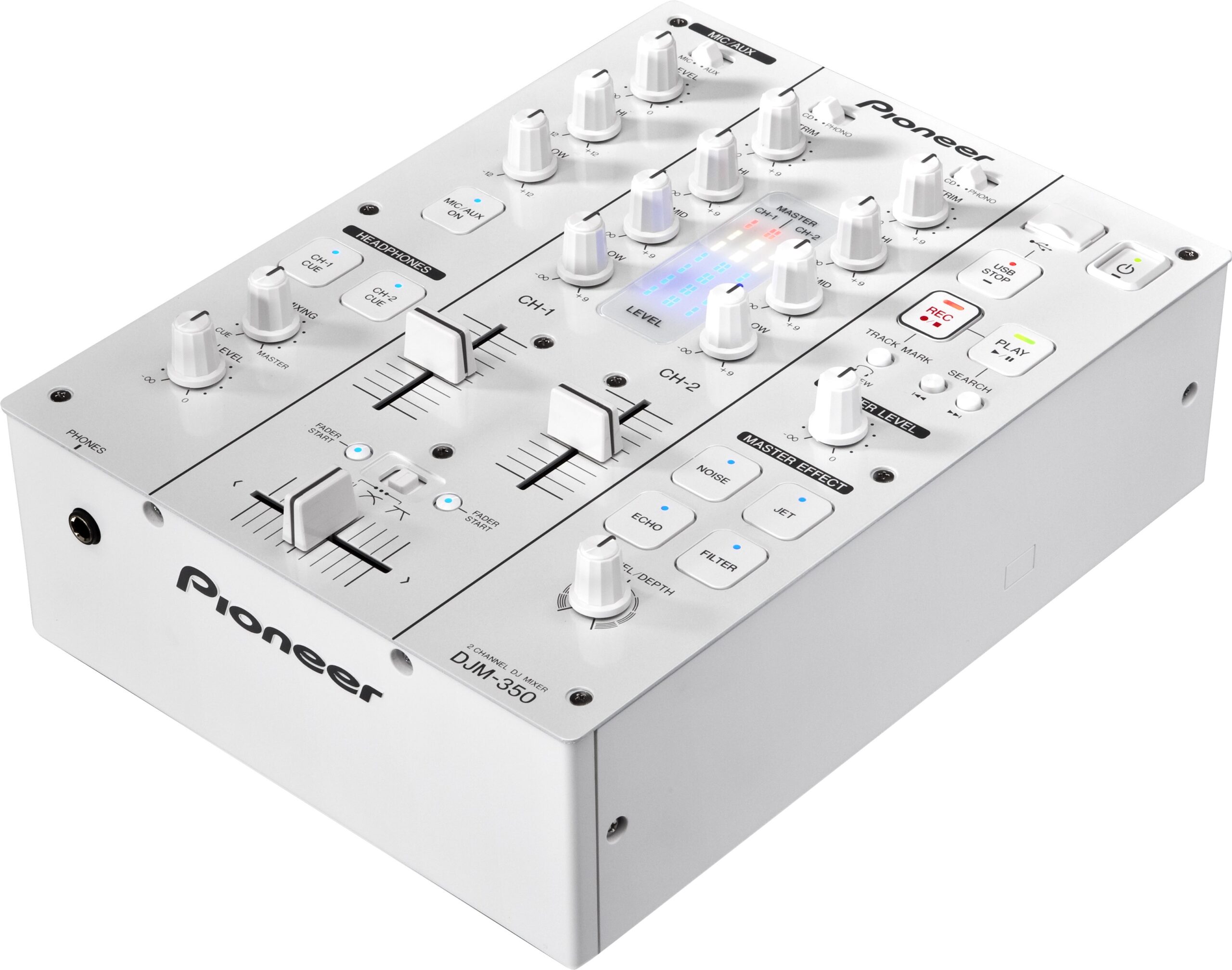 2-kanálový mixážní pult DJM-350 v bílém provedení s instantním nahráváním přímo na USB.
